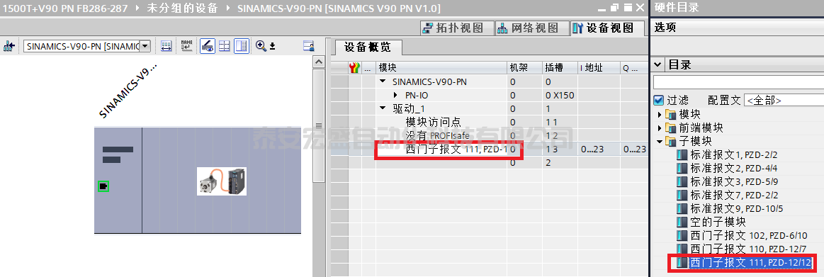 2. 創(chuàng)建項(xiàng)目后添加PLC后,在網(wǎng)絡(luò)視圖中將"其他現(xiàn)場(chǎng)設(shè)備"下的V90 PN拖到網(wǎng)絡(luò)中