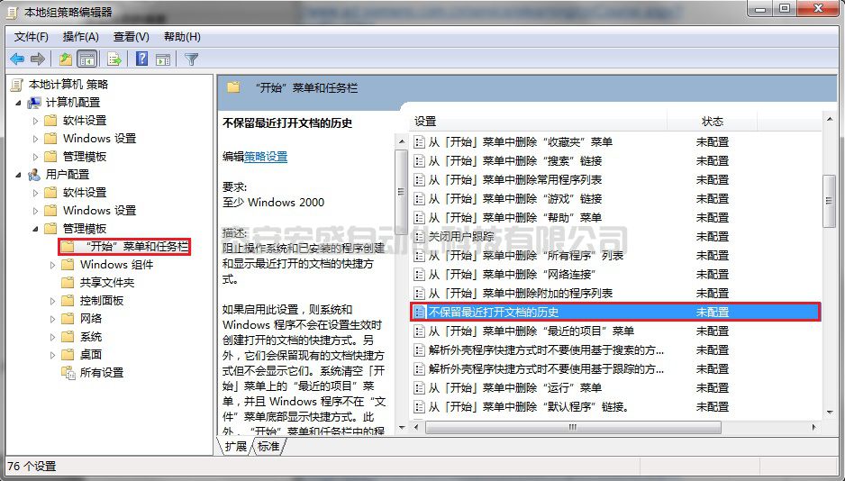 gpedit.msc文件一般位于如下路徑 C:\Windows\System32\gpedit.msc。 - 在彈出的“本地組策略編輯器”窗口中,打開(kāi)"用戶配置\管理模板\"開(kāi)始"菜單和任務(wù)欄,并導(dǎo)航到“不保留最近打開(kāi)文檔的歷史",如圖2.所示。