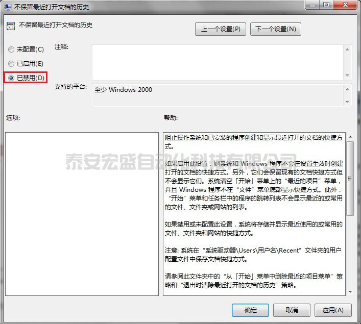 圖2. 本地組策略編輯器 - 雙擊“不保留最近打開(kāi)文檔的歷史",并在彈出的對(duì)話框中選擇”已禁用“并”確定“,如圖3.所示。
