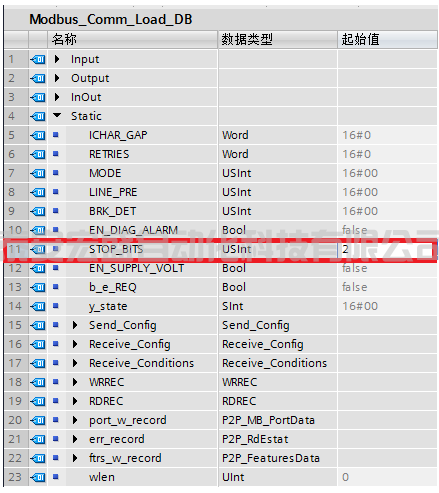 Modbus_Commload 指令的背景 DB 里 Static 修改 STOP_BITS停止位數(shù)值為 2(默認值=1)