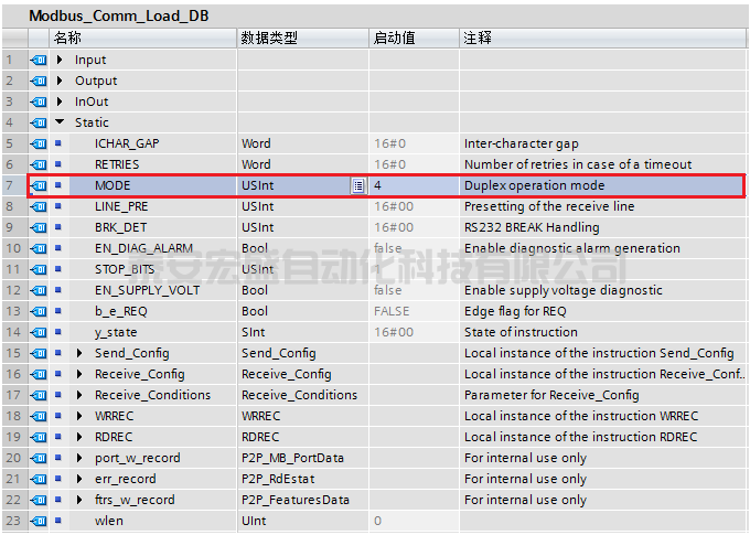 圖12. Modbus_Comm_Load背景數(shù)據(jù)塊靜態(tài)變量“MODE”修改為