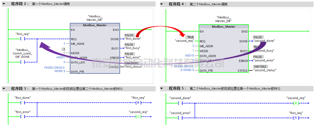 ④當Modbus RTU網(wǎng)絡(luò)中存在多個modbus RTU從站或一個modbus RTU從站同時需要讀操作和寫操作,則需要調(diào)用多個Modbus_Master指令,Modbus_Master指令之間需要采用輪詢方式調(diào)用。