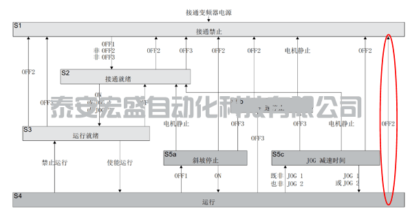 2) 當變頻器處于S4運行狀態(tài)時,變頻器會按著OFF1斜坡下降時間進行制動,電機靜止后切換為S2接通就緒。