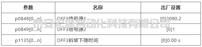 設(shè)置參數(shù)p0848[X],p0849[X]兩個參數(shù)為邏輯與的關(guān)系,當有一個參數(shù)置0時,變頻器觸發(fā)OFF3停車命令。