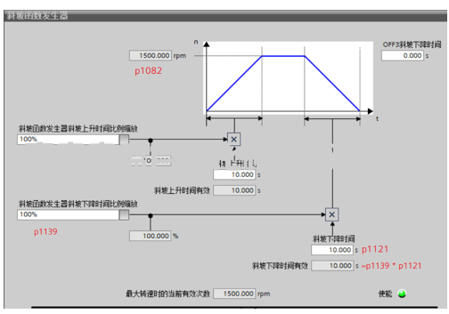 設(shè)置參數(shù)p1121、p1139。在該時間內(nèi)斜坡函數(shù)發(fā)生器的轉(zhuǎn)速設(shè)定值從最大轉(zhuǎn)速(p1082)運行到靜止(設(shè)定值 =0),如下圖舉例所示。