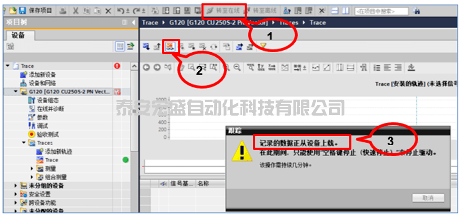 Startdrive 的Trace組態(tài)配置保存在變頻器中,在Trace觸發(fā)記錄過程中,變頻器需要一值保持上電狀態(tài)。否則,記錄數(shù)據(jù)會丟失。