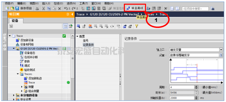 激活Trace記錄功能后,選擇“轉(zhuǎn)至離線”。之后等待故障發(fā)生,故障發(fā)生時數(shù)據(jù)會記錄到變頻器中。