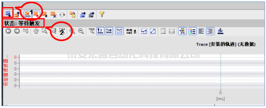 點擊按鈕 “在設備上安裝軌跡”,變頻器會裝載Trace設置并自動激活Trace,在狀態(tài)處顯示: “等待觸發(fā)”,如下圖1-6所示。