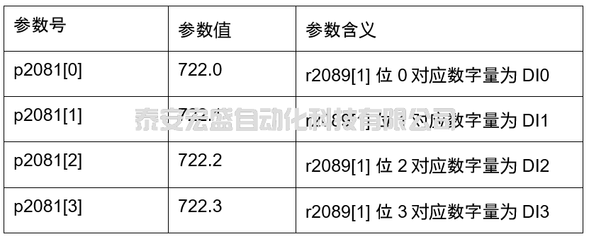 組合后的字對應(yīng)的參數(shù)為r2089.1,按上述設(shè)置后,r2089.1 bit 0為DI0狀態(tài),以此 類推r2089.1 bit 3為DI3狀態(tài),最后設(shè)置p2051.2=2089.1。