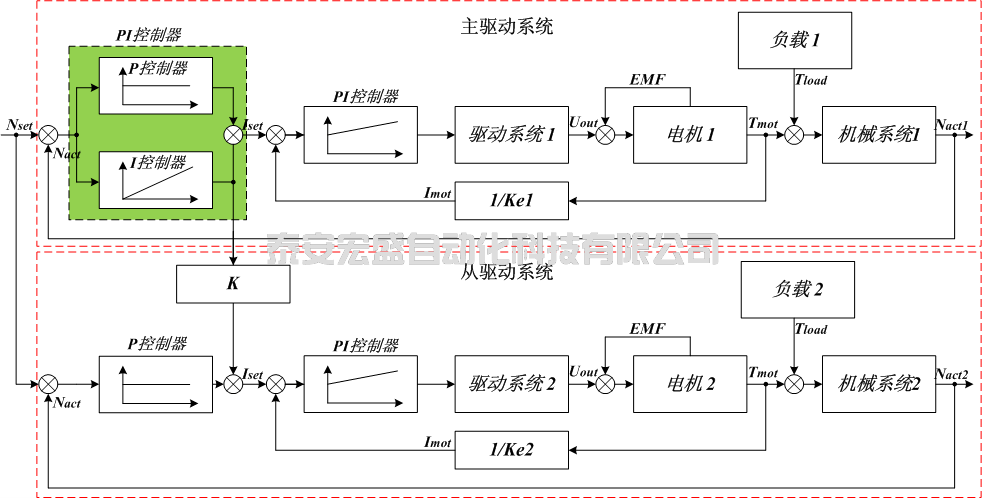 對于主機(jī)來講采用速度調(diào)節(jié)器為PI控制,實現(xiàn)工藝(一般都是一階激勵)轉(zhuǎn)速的轉(zhuǎn)速無差控制,在動態(tài)過程中由于從機(jī)的速度調(diào)節(jié)器采用P控制,從而使從機(jī)的實際轉(zhuǎn)速與通過機(jī)械耦合的主機(jī)轉(zhuǎn)速形成速度偏差,這樣與由上述描述的應(yīng)用場景所造成的偏差趨勢是一致的,進(jìn)而實現(xiàn)了從機(jī)與主機(jī)的“解耦合”,減小主從之間動態(tài)過程所產(chǎn)生偏差的強(qiáng)耦合影響,減小系統(tǒng)振蕩的程度。