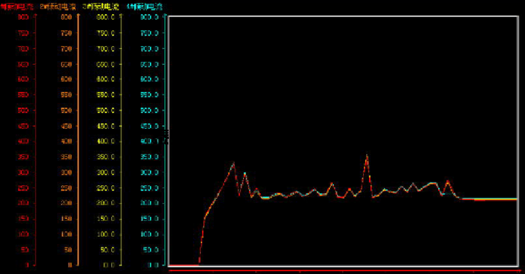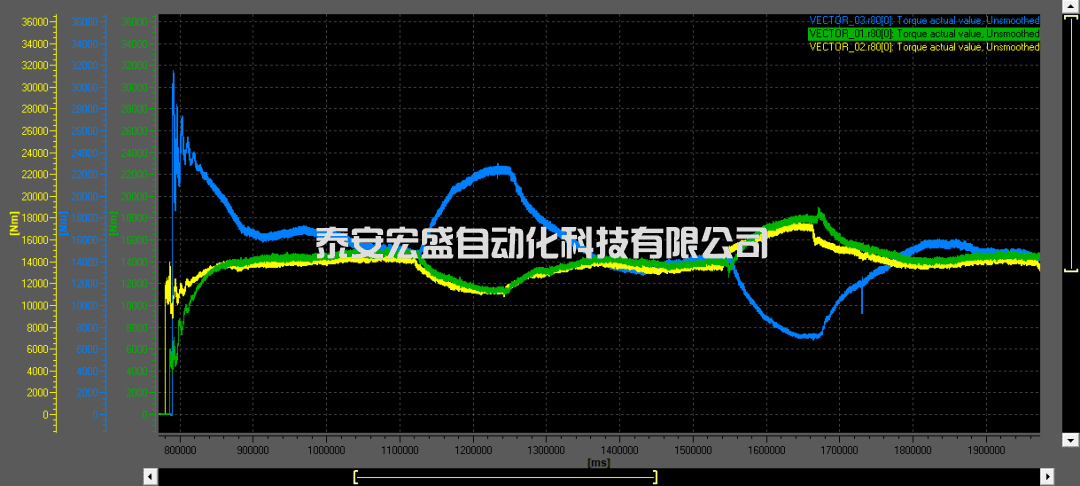 實際測試效果能夠很好的滿足工藝要求,啟動過程中皮帶平穩(wěn)建立張力,然后進(jìn)入穩(wěn)定的勻速運(yùn)行。設(shè)備運(yùn)行過程中3臺電機(jī)的輸出轉(zhuǎn)矩曲線如下圖所示: