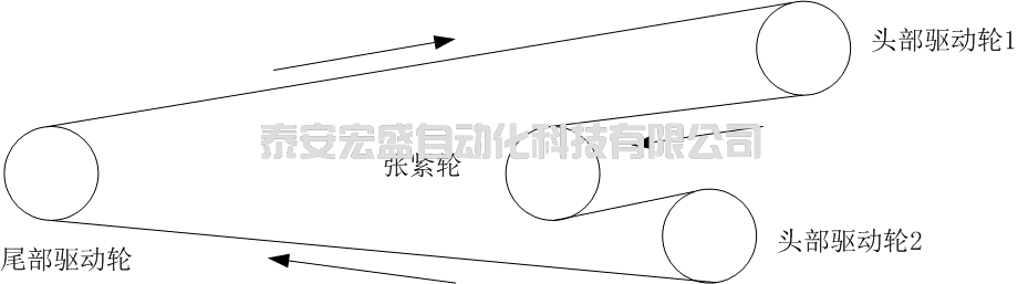 常見的軟連接負(fù)荷分配應(yīng)用案例包括帶式輸送機(jī)。如下圖所示的帶式輸送機(jī),采用3個驅(qū)動輪和一個張緊輪,其中頭部有兩個驅(qū)動輪,尾部有一個驅(qū)動輪。每個驅(qū)動輪各有一臺電機(jī)驅(qū)動,分別通過一臺變頻器實現(xiàn)輸送機(jī)的啟停和調(diào)速。