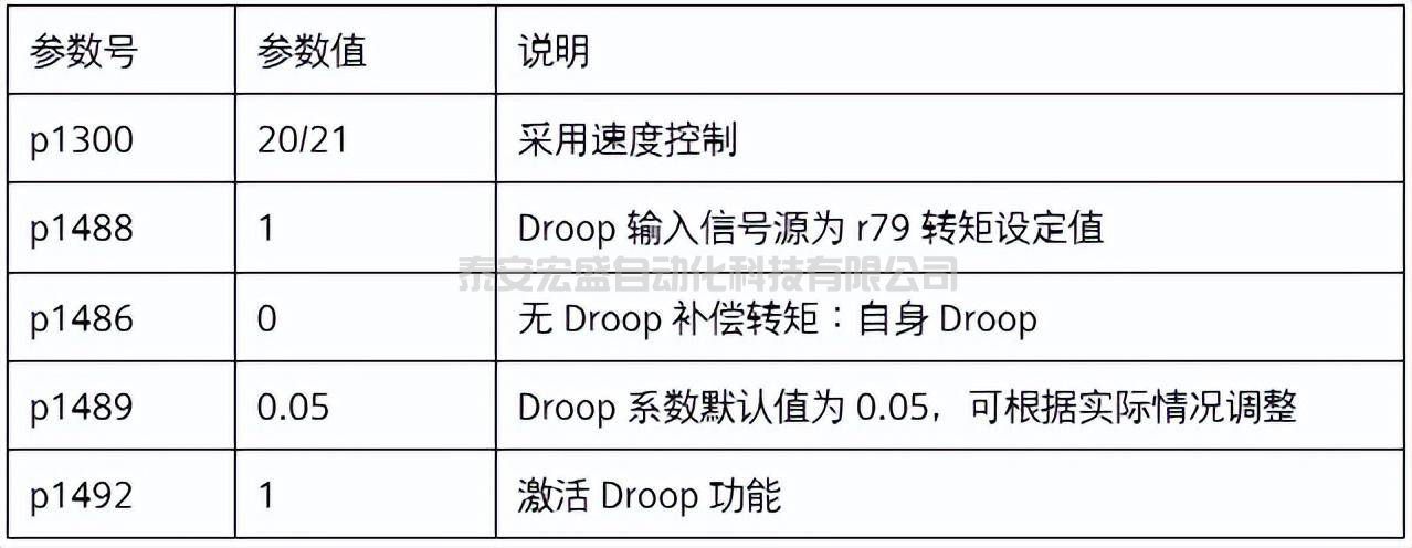 在這個案例中,我們采用每臺變頻器各自激活Droop的方式實現(xiàn)符合分配,采用相同的Droop系數(shù),當(dāng)自身輸出轉(zhuǎn)矩較大時,自動降低輸出轉(zhuǎn)速,從而減小輸出轉(zhuǎn)矩,由此達(dá)到動態(tài)平衡。