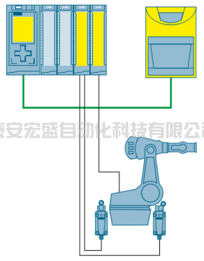 F-CPU 和激光掃描儀可通過 PROFINET 與錯(cuò)誤安全“PROFIsafe”配置文件進(jìn)行通信。可通過兩個(gè)傳感器(例如 SIRIUS 位置開關(guān))來檢測(cè)機(jī)器人位置。