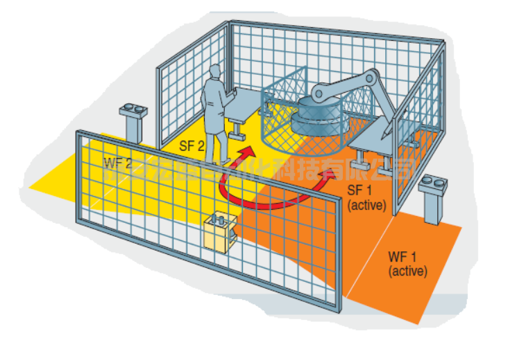 激光掃描儀可根據(jù)機(jī)器人的位置監(jiān)視危險(xiǎn)區(qū)域,并在機(jī)器人進(jìn)入保護(hù)區(qū)域后關(guān)閉其安全 OSSD 輸出(輸出信號(hào)切換裝置),從而使 F-CPU 關(guān)閉機(jī)器人。