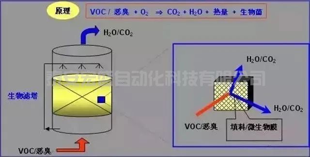 生物滴濾法即:將廢氣經(jīng)過去塵增濕或降溫等預(yù)處理工藝后,從濾床底部由下向上穿過由濾料組成的濾床,廢氣由氣相轉(zhuǎn)移至水—微生物混和相,通過固著于濾料上的微生物代謝作用而被分解掉。