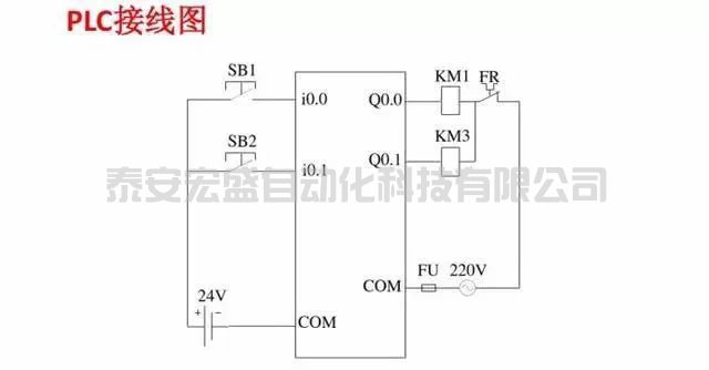 三、電動機的順序啟動、逆序停止(I/O分配表、PLC接線圖、梯形圖程序)