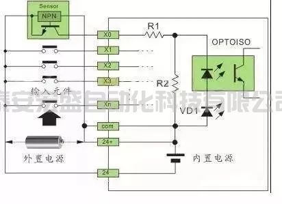 SINK輸入方式,可接 NPN 型傳感器,即 X 端口與負(fù)極相連。