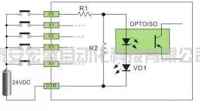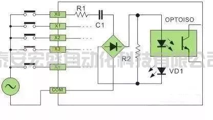 直流電可以由PLC內(nèi)部提供也可以外接直流電源提供給外部輸入信號(hào)的元件。R2在電路中的作用是旁路光電耦合器內(nèi)部LED的電流,保證光電耦合器LED不被兩線制接近開關(guān)的靜態(tài)泄漏電流導(dǎo)通。
