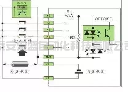 注:24VDC供電的傳感器,在輸入回路上需要串聯(lián)限流電阻,R1為10Ω,R2為2KΩ,不串聯(lián)限流電阻,將燒毀接口回路,限流電阻取值2.7KΩ。