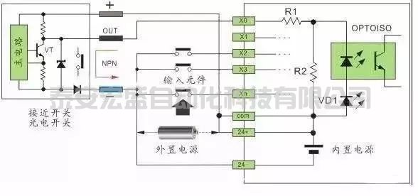 (外部輸入組件可以為按鈕開關(guān)、行程開關(guān)、舌簧開關(guān)、霍爾開關(guān)、接近開關(guān)、光電開關(guān)、光幕傳感器、繼電器觸點(diǎn)、接觸器觸電等開關(guān)量的元件。)