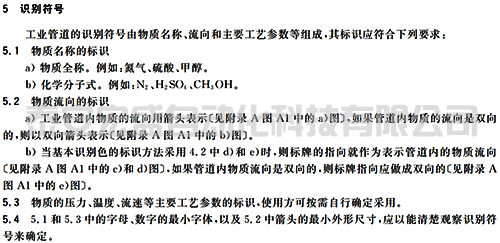 當(dāng)采用②③④⑤方法時(shí),二個(gè)標(biāo)識(shí)之間的最小距離應(yīng)為10m,③④⑤的標(biāo)牌最小尺寸應(yīng)以能清楚觀察識(shí)別色來(lái)確定。當(dāng)管道采用②③④③基本識(shí)別色標(biāo)識(shí)方法時(shí),其標(biāo)識(shí)的場(chǎng)所應(yīng)該包括所有管道的起點(diǎn)、終點(diǎn)、交叉點(diǎn)、轉(zhuǎn)彎處、閥門(mén)和穿墻孔兩側(cè)等的管道上和其他需要標(biāo)識(shí)的部位。