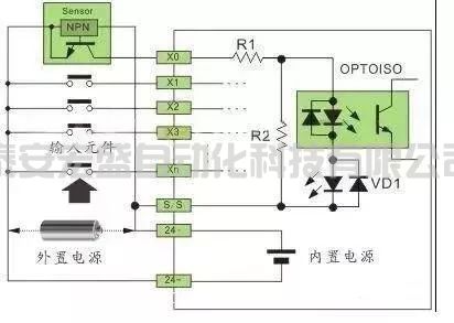 注:24VDC供電的傳感器,在輸入回路上需要串聯(lián)限流電阻,R1為10Ω,R2為2KΩ,不串聯(lián)限流電阻,將燒毀接口回路,限流電阻取值2.7KΩ。