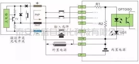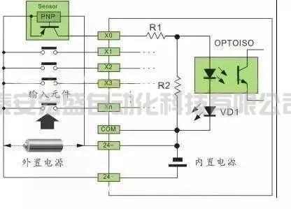 SOURCE源型為電流從輸入端流進,那么輸入端與電源正極相連即可,說明接口內(nèi)部的光電耦合器為單端共點為電源負極,可接PNP型傳感器。