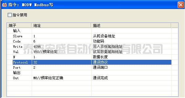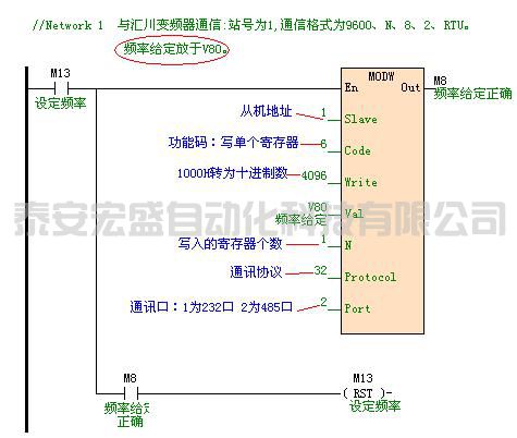 通過以上設置我們可知,本例控制匯川變頻器采用Modbus通信協(xié)議,通信資料格式為:9600 N 8 2 ,變頻器的地址為1。然后對相應的地址寫值就可以了。
