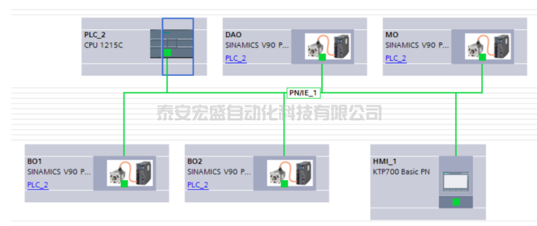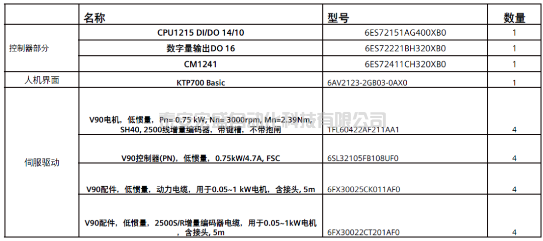 該項目采用1臺1215PLC加1塊CM1241通訊模塊,驅動采用4臺低慣量0.75KW的V90PN型伺服控制器。觸摸屏采用KTP700.