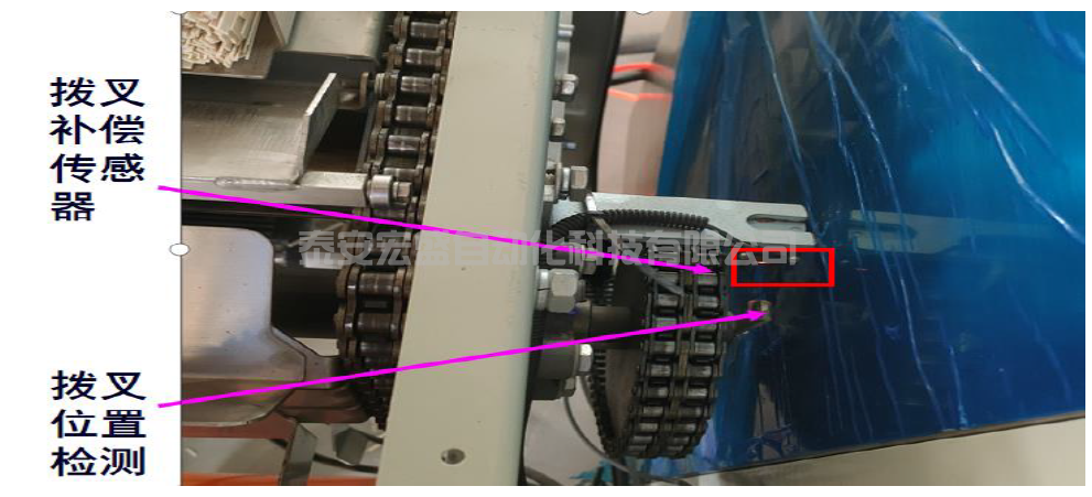 為了保證包裝物在包裝袋的中心位置,需要保證撥叉送料的位置與包裝膜的每包的相對位置保持一致,需要通過電開關(電眼)對撥叉進行位置校準,通過比較色標點對應的撥叉位置來比較撥叉的位置是否需要調整,通過差值計算調整速度的增大或者減少,來補償位置的差值。原理與色標補償一致。