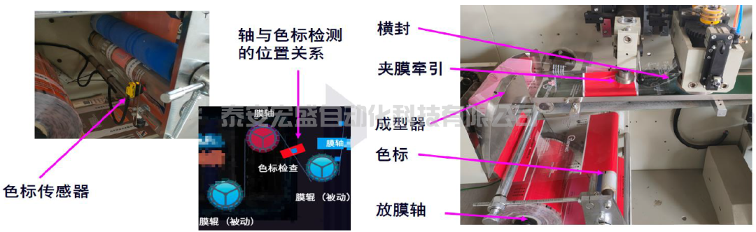 為了保證包裝成品袋上商標圖案的完整,通常在制作包裝材料時印刷上用于定位的色標。使用這種印有色標的包裝材料時,可用光電開關(電眼)對色標進行跟蹤定位,通過控制系統(tǒng)驅動伺服系統(tǒng)并按照色標之間的距離自動調整,達到包裝成品商標圖案完整性。