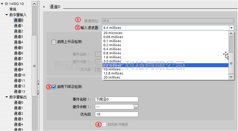 ② “輸入濾波器”:為了抑制寄生干擾,可以設(shè)置一個延遲時間,即在這個時間之內(nèi)的干擾信號都可以得到有效抑制,被系統(tǒng)自動濾除掉,默認(rèn)的輸入濾波時間為 6.4 ms;