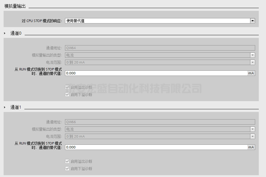 ⑤ “從 RUN 模式切換到 STOP 模式時,通道的替代值”:如果在模擬量輸出設(shè)置中,選擇“使用替代值”,則此處可以設(shè)置替代的輸出值,設(shè)置值的范圍為 0.0~20.0mA,表示從運行切換到停止?fàn)顟B(tài)后,輸出使用設(shè)置的替代值。如果選擇了“保持上一個值”則此處為灰色不能設(shè)置;