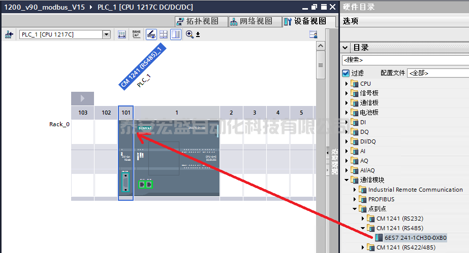 (1) 在設(shè)備視圖中將實際使用的通信模塊拖入到畫面中