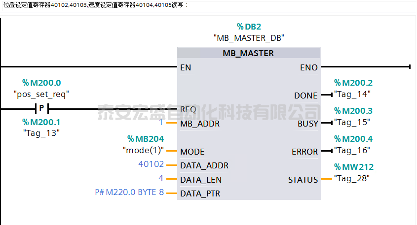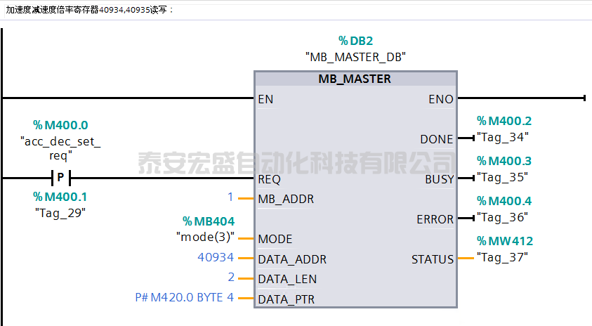 (6) 通過MB_MASTER功能塊,將位置設(shè)定值和速度設(shè)定值以及加速度減速度倍率寫入寄存40102、40103、40932、40933、40934和40935中