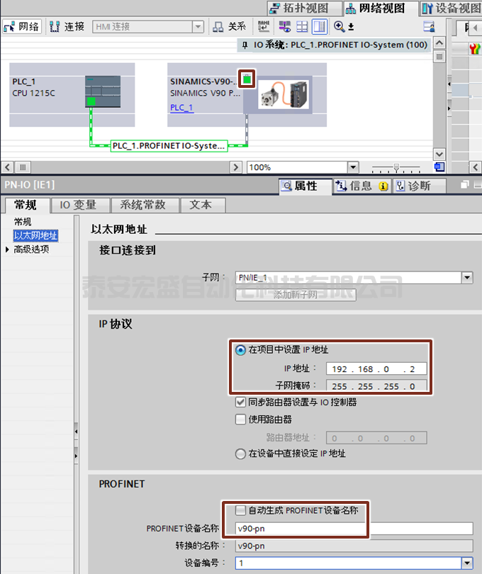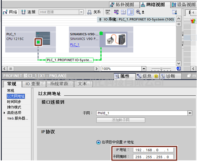 2. 建立V90 PN與PLC的網絡連接,并分別設置S7-1200及V90 PN的IP地址及設備名稱: