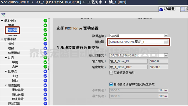 配置軸的驅動,選擇連接到PROFINET總線上的V90 PN:可以手動設置參考轉速及最大轉速,也可以選擇"自動傳送設備中的驅動裝置參數"。