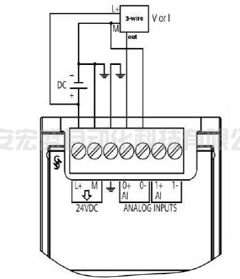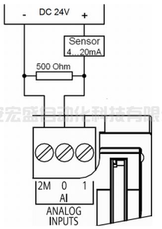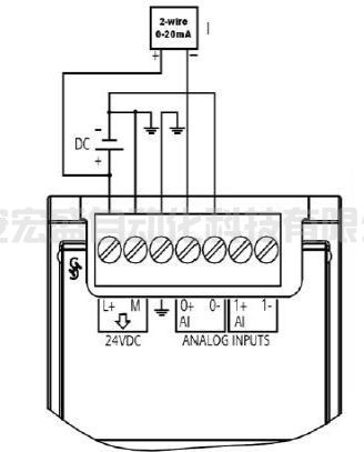以 S7-1200 自帶模擬量輸入通道接入常用的兩線制傳感器 4-20mA 電流信號為例, 如下圖: