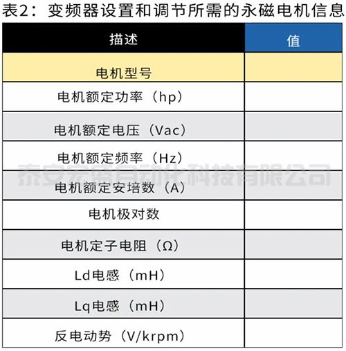 下面是一個(gè)變頻器設(shè)置和調(diào)諧示例,用于在鼓風(fēng)機(jī)應(yīng)用中運(yùn)行永磁電機(jī)。在設(shè)置和調(diào)諧驅(qū)動(dòng)器之前,需要了解以下10 條信息(如表2 所示)。