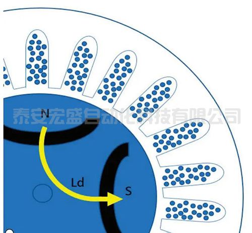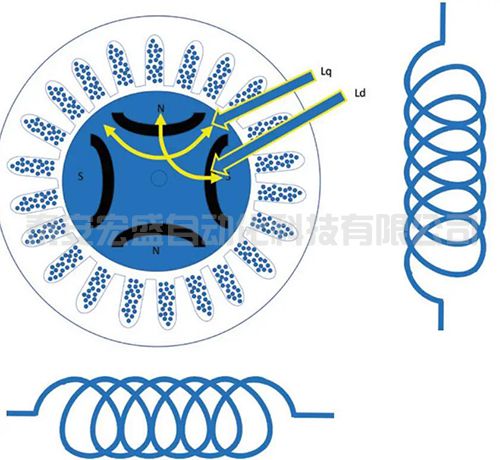 電阻以及L d 和L q 電感值(顯示電感路徑)。L d 和L q 電感為通常相隔90 度的兩個(gè)矢量控制坐標(biāo)。流經(jīng)L d(右)的電流決定磁場(chǎng)的控制。通過(guò)L q(底部)的電流決定扭矩的產(chǎn)生。