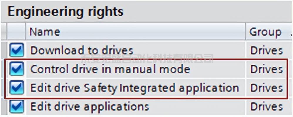 編輯驅(qū)動器安全集成應(yīng)用的權(quán)限,也就是說可以定義允許編輯標(biāo)準(zhǔn)驅(qū)動器參數(shù)的權(quán)限,但不允許編輯安全參數(shù)的用戶。