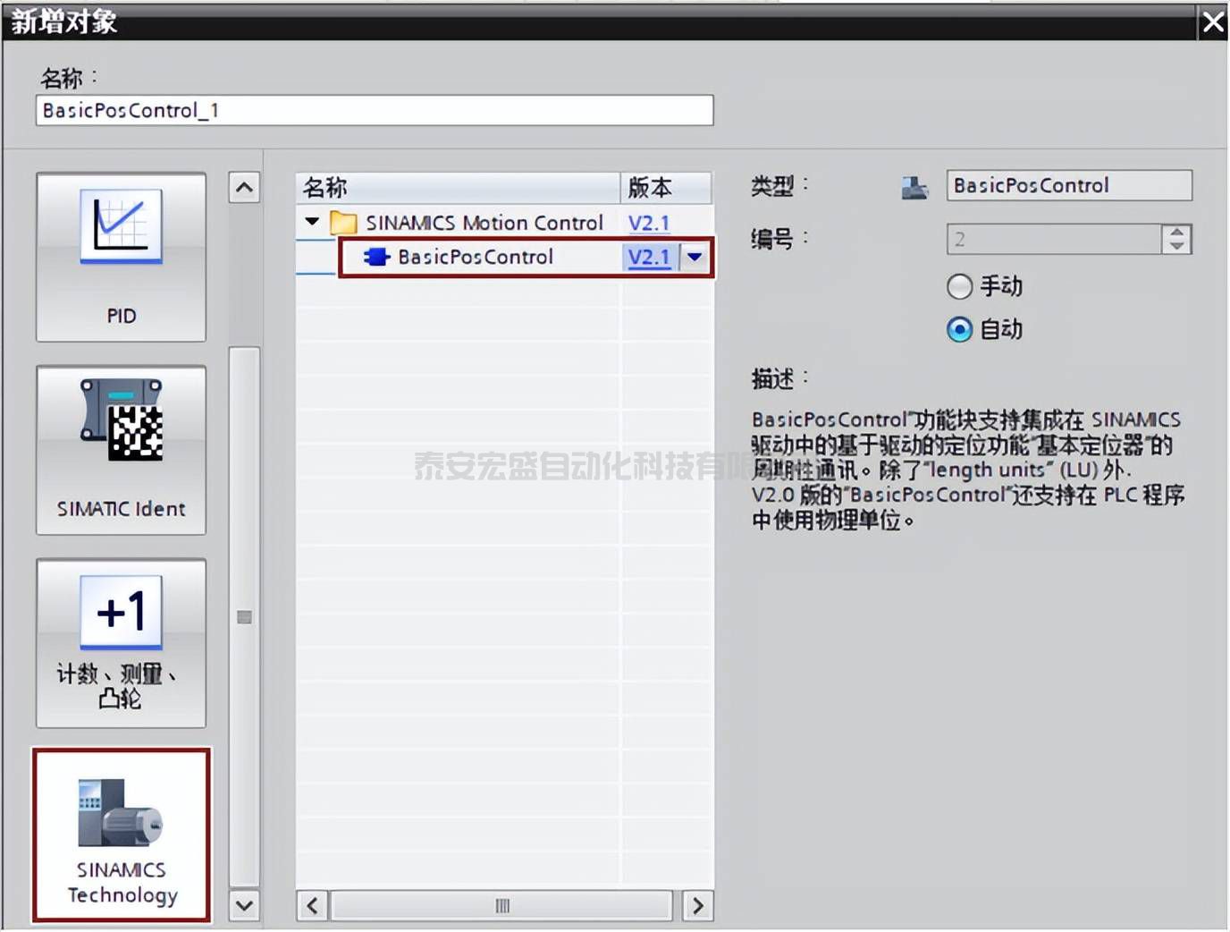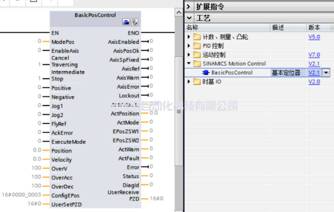之后,可以采用 SINAMICS Technology 創(chuàng)建 BasicPosControl 工藝對象,采用 BasicPosControl 基本定位器功能塊實現(xiàn)對 V90PN 驅(qū)動器的位置控制。